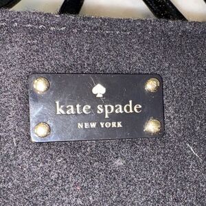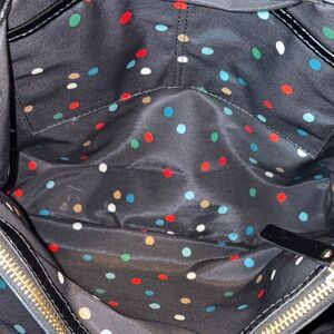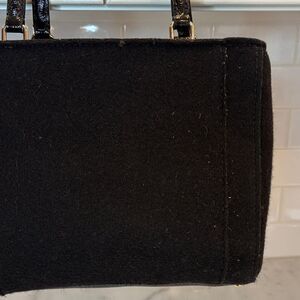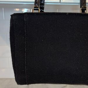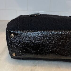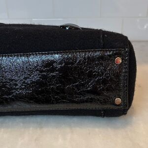 The designer Kate Spade Quinn Beantown Wool Satchel is a black satchel-style handbag primarily constructed from wool felt, featuring black patent leather trim and handles. The main body of the satchel is made of black wool felt, complemented by black patent leather on the trim and handles. It features light gold hardware, including the handle attachments and a centered, engraved gold Kate Spade logo plate on the back (or front) The front of the bag is decorated with six large, black, button-like embellishments arranged in two columns of three. It features double black patent leather handles. The satchel utilizes a zip closure to secure the main compartment. The interior features a polka dot lining and includes an internal zipper pocket. The bag is equipped with feet on the bottom to protect the material when set down. It has a rectangular shape, with a width of approximately 11.5" x 9" x 4" Handle drop - 7.5" Photos are the most accurate description of this stunning wool classic bag. Zoom on photos, ask questions and make an offer!