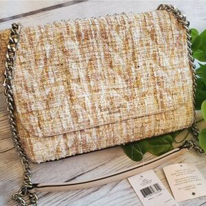 Brand new with tags, direct from Kate Spade. This bag gives major Chanel vibes the soft pastel tweed design and thick chain detail strap this bag gives!