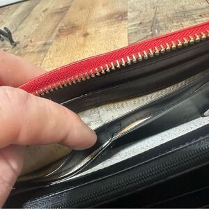 Pre owned condition - does have some signs of prior wear-there are some specks on front side of wallet that are not coming off, on the interior card slots the stitching has come out 1/4 of the way so they card slots are not completely separated. There is also some signs of wear to the zipper pull