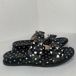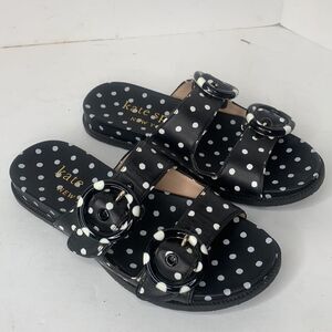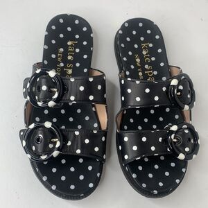 Kate Spade black and white polka dot leather slides with double straps and round adjustable buckle. Rubber outsole. Excellent condition
