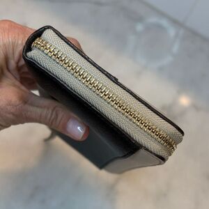 Authentic Kate Spade Two-Tone Colorblock Full Zip Continental Wallet. Cream and black textured leather with black leather Kate Spade gold spade on front. Gold toned hardware is a great accent. Accordion style flexibility makes this wallet great for storing all of your needs. Full zipper opens to tan leather interior with the classic black and white polka dot logo fabric. 12 card slots, 2 cash slots, 2 larger compartments and a full zipper compartment. Full size slip pocket on the back of the wallet. Approximate measurements - 7.5" x 4" Photos are the best detailed description of this classic ks wallet. Zoom on photos, ask questions and make an offer!!
