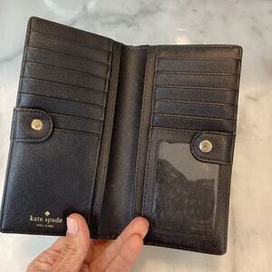 This elegant Kate Spade wallet showcases a sophisticated blend of blue and black hues, crafted from premium leather. Its sleek, minimalist design is perfect for both formal and casual occasions, offering a timeless accessory to complement any outfit.