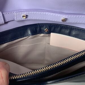 Kate Spade lavender/blue leather crossbody bag with cut-out kitten embellishments on front flap and gold tone chain strap. Rear zipper pocket and front flap snap closure. Removable chain strap that converts to clutch/wallet. Interior double compartments with middle zipper pocket. Rear compartment has 6 card slots and easily hold any smartphone. New with tags