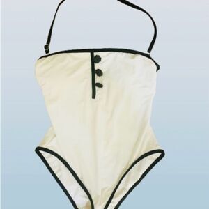 This stylish one-piece swimsuit by Kate Spade showcases a timeless white and black color scheme, featuring a modern high-cut leg and a flattering scoop neckline. Made from premium swim fabric, it offers excellent stretch and water performance, perfect for both swimming and lounging by the pool. Some wear on buttons. Good Condition!