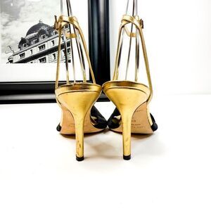 Step into luxury with these stunning Kate Spade New York gold and black bow heels, size 6.5 (EU 37). Crafted in Italy, these elegant heels feature a shimmering gold leather design with a chic black bow accent, a delicate ankle strap, and a sleek stiletto heel. Perfect for weddings, parties, or any occasion where you want to add a touch of glam to your look.