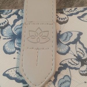 the wallet has blue butterflies it.