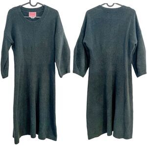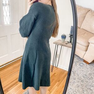 Features 3/4 length sleeves, crew neck, A-line style, ribbed cuffs and hems, ribbed fitted high waist, puff sleeves, soft textured fabric, knee length, unlined, dark green, material tag has been removed- 65%cotton, 17% polyamid, 10% acrylic, 7% wool, 1% elastane