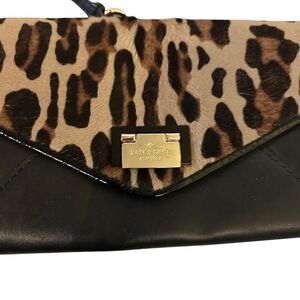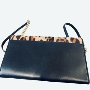 Cowhide and leather, detachable cross strap, messenger style, clasp closure, roomy enough for cell phone and all your basic needs