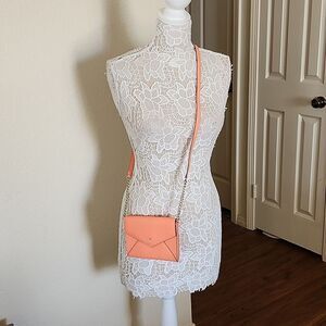 Super cute little envelope style bag in a pretty coral/peach color. Removable strap with a 22" drop. EUC Coach1.11002