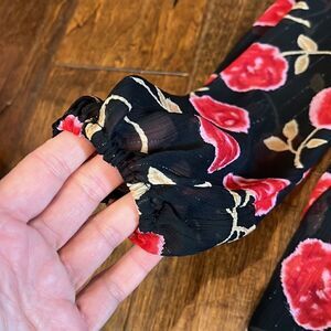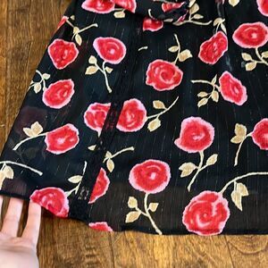 So pretty! Beautiful red and pink roses in a black background m, with metallic threading throughout !