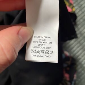 Features: long sleeve, elastic cuffs and waist, V neck, 2 button closure at collar, knee length, black with floral pattern, poly chiffon