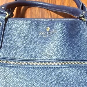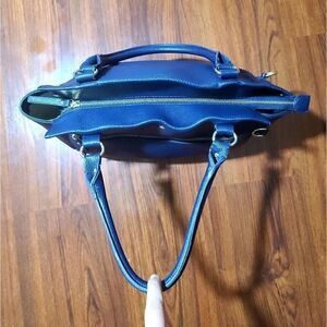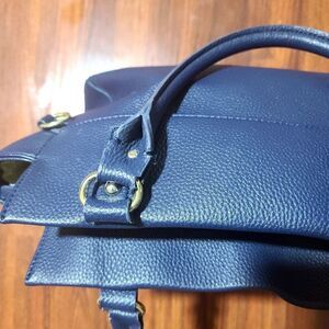 Beautiful peppled leather navy blue tote with gold detailing and two interior compartments all details pictures above