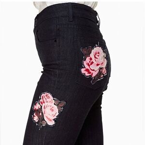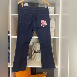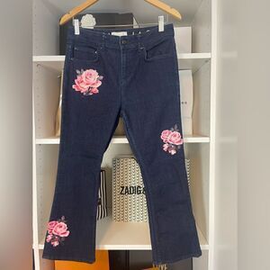 Cropped kick flare jeans with rose detail! Waist 15”, rise 10.5, inseam 24”. Excellent condition. Questions? Leave a comment below!