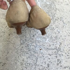 These are tan moccasin slipper on's heel is about an inch and a half. They need to go to the shoe man to be clean or you need to clean, price reflects. One of the heel taps should be changed and the soles show wear.Please look at pictures, sold as is