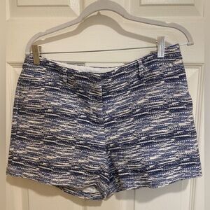 Tweed shorts in blue, white and metallic silver thread. Zip fly with hook closure. Front and back pockets. Excellent pre owned condition. Approximate measurements: waist 16”, front rise 9”, inseam 4”