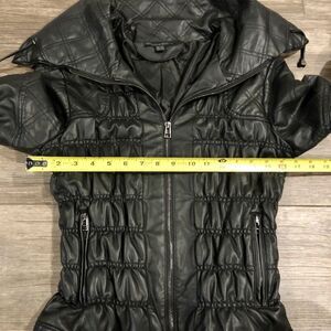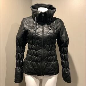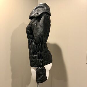 Katherine Barclay Faux Leather Coat Small Black Puffer Stretch Funnel Neck