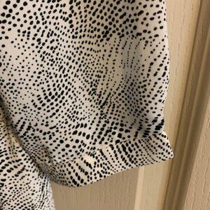 Katherine Barclay Montreal one piece romper/shorts 3/4 sleeve, two side slash pockets, adjustable self-tie, black and white print, hidden front buttons. pleated placket. Excellent condition. Light and flowing, lined, 100% polyester. Great for vacation, travel no wrinkle, beach wedding, casual or dressing.