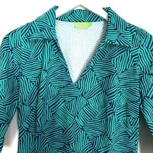 Collared dress in navy blue and turquoise print. Nylon spandex blend.