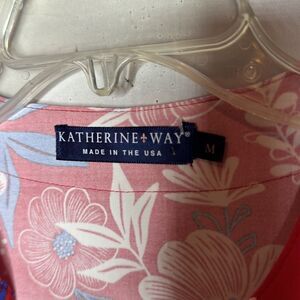 Katherine Way Marco Stretch Tunic. Size Medium. 3/4 Ruffle sleeve. U neck detail. Red, white and blue floral design. Excellent like new condition.