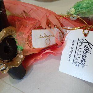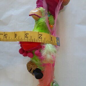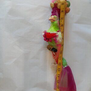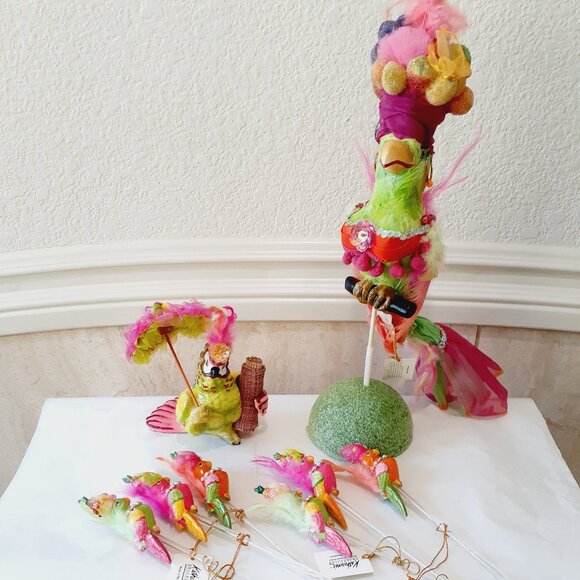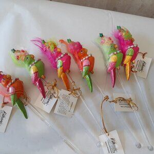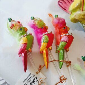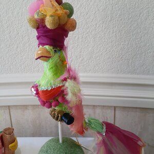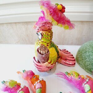 Colorful parrot and friends ready for carnival! A decorative parrot center piece, a cockatoo toothpick holder and six bird stir sticks