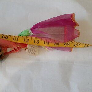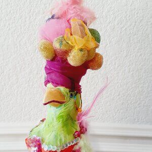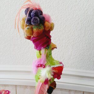 Parrot, has a beaded fruit hat, feathers, sequin trim top, chiffon dress