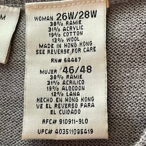 Kathie Lee Ramie Wool Blend Gray Floral Print Cardigan Button Front Size 26/28W. Full button front opening. Fabric content is 38% ramie, 31% acrylic, 19% cotton, and 12% wool. Gorgeous floral print on front.