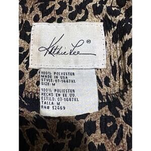 The Kathie Lee Women's Cheetah Leopard Print Stretch Short Sleeve Blouse Top in size M is a stylish and versatile garment suitable for casual occasions. Made from lightweight and stretchy polyester knit fabric, this blouse features a round neckline and padded shoulders for a flattering fit. With a black and brown animal print pattern, this blouse is easy to care for and perfect for all seasons. It also has a pull-on closure and is machine washable for added convenience. Ideal for women looking for a basic yet trendy top with a touch of leopard print.
