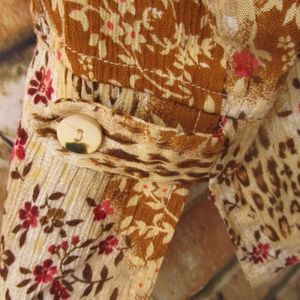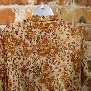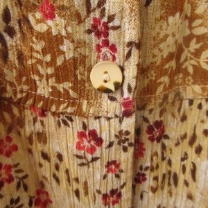 Kathie Lee top 100%Rayon button down size Extr/Lrg Measures: 23 Inches pit to pit, 24 inches shldr to hem with 3 inch side slit on each side with one button closure on each slit. Floral design with beige background with brown and rose flowers No rips or stains. M-02