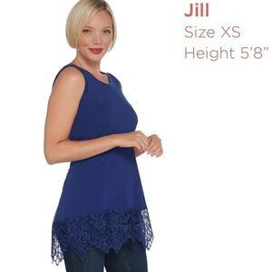 A lacy hem lends this swing cami to layering under hi-low hem or cropped tops, or pairing with your favorite jean jacket.