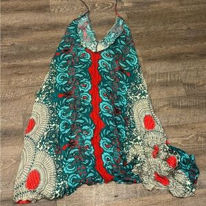 Vibrant bohemian maxi dress with intricate patterns. Features red, teal, and cream colors.