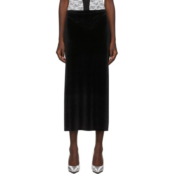 This black midi skirt from Kathryn Bowen is crafted from sumptuous velour/velvet with high slits at the sides and a mesh lining.
