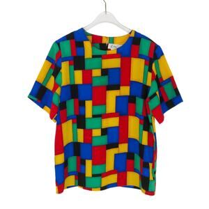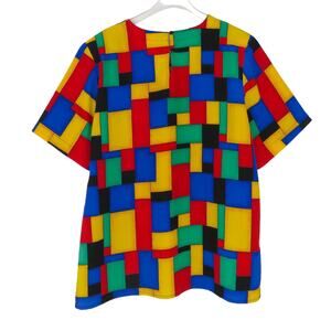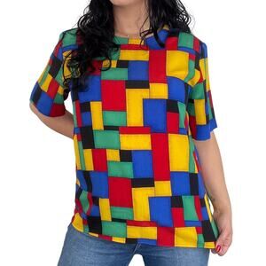 1980s Vintage Top with Vibrant Red, Yellow, Green, Blue, and Black Abstract Geometric Tops. Vibrant, Funky Classic 80s Print Casual Top with Short Sleeves & Shoulder Pads.