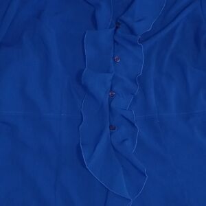 Kathy Che womens button down blouse. The front has ruffles around the front button area and the long sleeves have ruffles at the ends