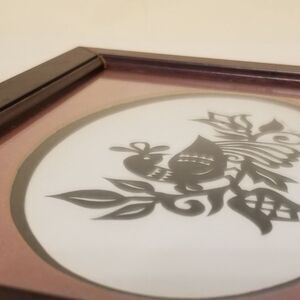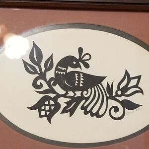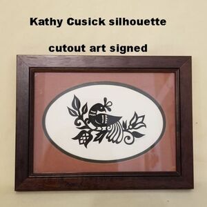 Kathy Cusick silhouette art. Silhouette of a bird layered onto the ivory background. Not sure if she used paper or another material. Nicely framed, her stamp is still on the back. Size is 8 1/2" x 6 1/2".