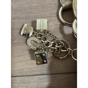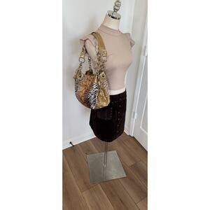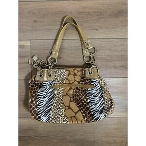 The Kathy Van Zeeland Animal Print Abstract Shoulder Bag Purse is a vintage piece from the Y2K era, featuring a unique design with animal print pattern and lucky dice charm. This medium-sized bag has a snap closure and double gold handles with a drop of 8 inches, making it easily accessible for everyday use. The exterior is made of polyester, while the lining is polyester in beige color. With a mix of studded accents, gold hardware, and an awesome bag charm with lucky dice (some of the charms have scratching and scuffing).