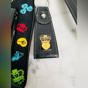 Fun, stylish, and functional — this Kathy Van Zeeland shoulder bag features a black canvas background with colorful designs and eye-catching logo and charm decorations. Accented with silver hardware, it has an adjustable strap for comfort and multiple compartments to keep your essentials organized.