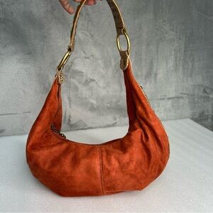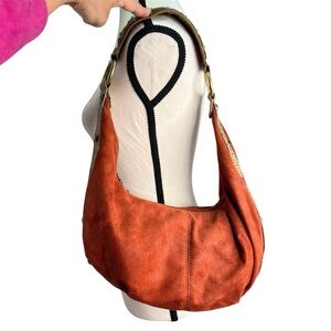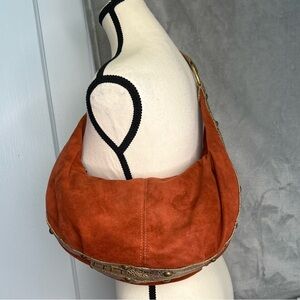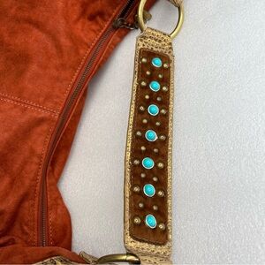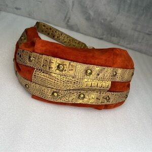 Unique Kathy Van Zeeland Burnt Orange Baguette Slouchy Purse Suede Croc Trim Metal Bead turquoise Fur Detail.