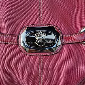 Preloved: So much character, pink coral faux patent leather trim/fabric hobo/shoulder handbag with a decorative front belt accent / silver tone hardware / double strap handles / magnetic snap closure / medium size / spacious interior / fabric lining / divided compartment / multiple zip & slot pockets / tassel zipper pulls / wide bottom base / signature crown & heart logo emblem by Kathy Van Zeeland.