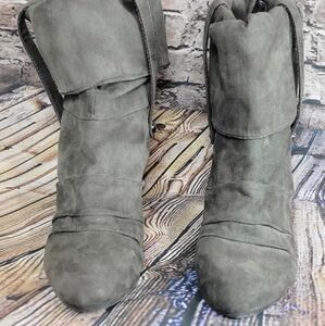 Gently used Kathy Van Zeeland scrunchy ankle boots with snaps to convert to knee-high boots. The heel height is approximately 2". These water-resistant boots are made from fabric.