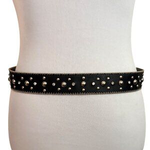 Kathy Van Zeeland Studded Belt Y2K Size S Edgy Rocker Rhinestone Black Silver Faux Leather Statement Buckle Rebel Biker Chick Studs Rodeo Queen Western