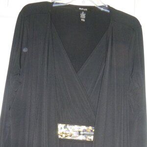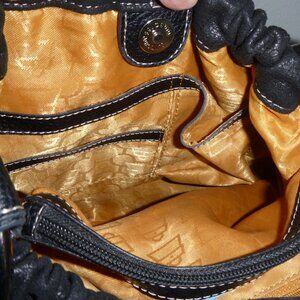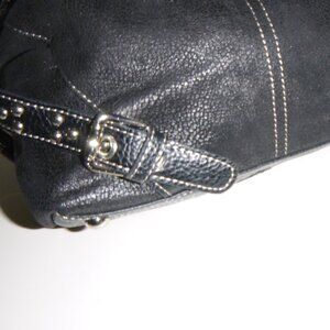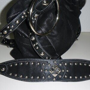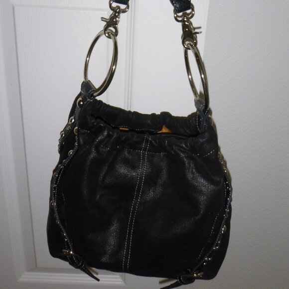 Kathy Van Zeeland, Black Leather purse with big metal rings, snap closure, has many pockets. Small metal feet on bottom. Studded details on strap and outside of purse. In very good condition.