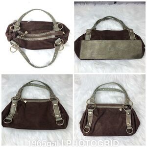 This is a great high fashion shoulder bag with studded straps with a green/gold metallic pattern with soft chocolate brown body