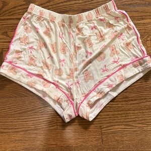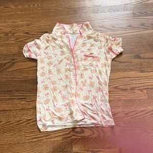 Short-sleeve bows and beats pajama set with pink accents. Features a button-up top and matching shorts.