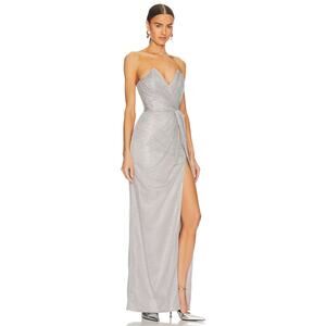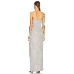 The Katie May x REVOLVE Finn Metallic Strapless Gown features a sleek strapless design with a side slit, crafted from shimmering silver fabric. This stunning gown offers a glamorous and modern look, perfect for making a statement at any formal event.