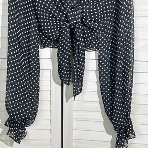 Emily’s black polka dot tie waist blouse on The Real Housewives of Orange County Polka dots chiffon (100% Polyester). Top. V-neck. Long sleeve. Tie closure. 18" from shoulder to hemline. Made in the USA of imported fabric.