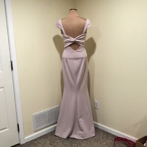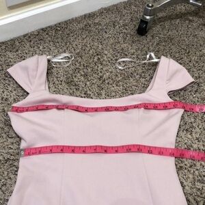 Excellent condition no stains rips or fading. Short sleeve, cap sleeve, scoop neck, mermaid trumpet hem dress with cut out bow tie back. Pastel blush pink. Stretchy material.
