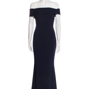 Beautiful, smooth, stretchy crepe flaunts and flatters curves in this elegant gown topped with a statement fold-over neckline and keyhole back. Hidden side-zip closure Off-the-shoulder neckline Lined 97% polyester, 3% spandex Dry clean Made in the USA of imported fabric Wedding Suite. Worn only once, excellent condition. I did add an elegant, conservative slit that falls just above the left knee which allows for easier movement, walking and dancing.