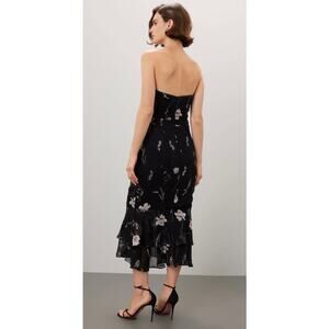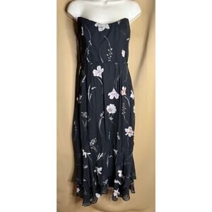 Black floral chiffon strapless sheath dress. 100% viscose. Sleeveless. Back zipper closure. 49.5” from shoulder to hemline.