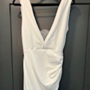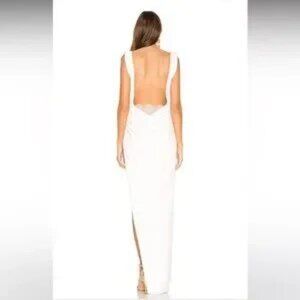 Elegant white gown with deep V-neck. Sleeveless design. High slit for added style.