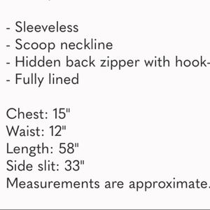 Ivory white crepe (97% Polyester, 3% Elastane). Gown. Sleeveless. Scoop neckline. Hidden back zipper with hook-and-eye closure. Fully lined. 33" side slit. See size and fit notes for full length.